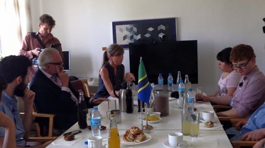 Come Together ambassadörerna på svenska ambassaden i Tanzania där de diskuterade hur viktigt det är med utbildning för att alla ska få möjlighet till bra liv. På bilden ses Come Together ambassadörerna Axel Isaksson, Joanna Johansson, Victoria Valverde, ambassadörernas side-kick Soran Ismail, Viktor Barkström och den svenska ambassadören i Tanzania, Lennart Hjelmåker.