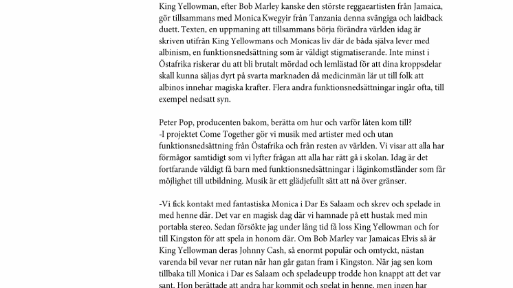 -I projektet Come Together gör vi musik med artister med och utan funktionsnedsättning från Östafrika och från resten av världen. Vi visar att alla har förmågor samtidigt som vi lyfter frågan att alla har rätt gå i skolan. Idag är det fortfarande väldigt få barn med funktionsnedsättningar i låginkomstländer som får möjlighet till utbildning. Musik är ett glädjefullt sätt att nå över gränser.