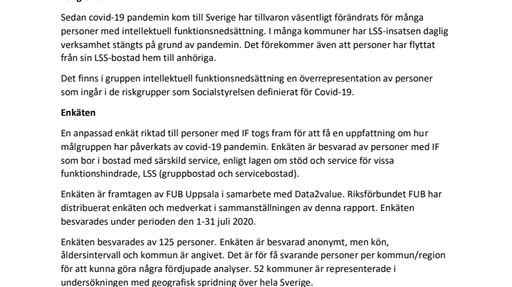 En enkätundersökning från FUB visar att personer med intellektuell funktionsnedsättning (IF) upplever att tillvaron blivit sämre än före pandemin. Många känner sig mer ensamma än tidigare. Hälften av dem som svarade på enkäten arbetade inte kvar på daglig verksamhet på grund av pandemin. Bland dessa svarade närmare hälften att de mår sämre än innan pandemin.