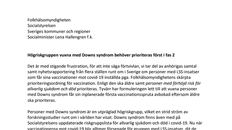 Vi kräver att Folkhälsomyndigheten lyfter vuxna personer med Downs syndrom till gruppen med högsta prioritering för vaccinering i fas 2. Det ska inte ha någon betydelse om personen har en LSS-insats eller ej.