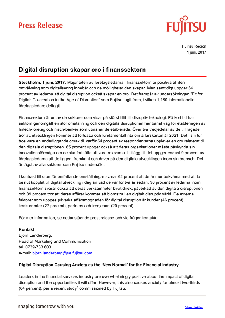 Majoriteten av företagsledarna i finanssektorn är positiva till den omvälvning som digitalisering innebär och de möjligheter den skapar. Men samtidigt uppger 64 procent av ledarna att digital disruption också skapar en oro. Det framgår av undersökningen ”Fit for Digital: Co-creation in the Age of Disruption” som Fujitsu tagit fram, i vilken 1,180 internationella företagsledare deltagit.