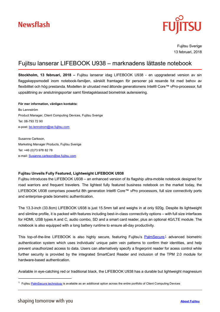 Fujitsu lanserar idag LIFEBOOK U938 - en uppgraderad version av sin flaggskeppsmodell inom notebook-familjen, särskilt framtagen för personer på resande fot med behov av flexibilitet och hög prestanda. Modellen är utrustad med åttonde generationens Intel® Core™ vPro-processor, full uppsättning av anslutningsportar samt företagsklassad biometrisk autensiering.