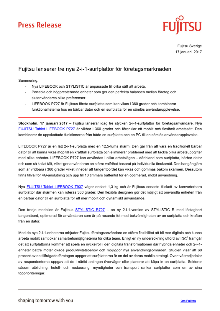 Fujitsu lanserar idag tre stycken 2-i-1-surfplattor för företagsanvändare: LIFEBOOK P727, LIFEBOOK T937 samt STYLISTIC R727. Portabla och högpresterande enheter som ger den perfekta balansen mellan företag och slutanvändares olika preferenser.