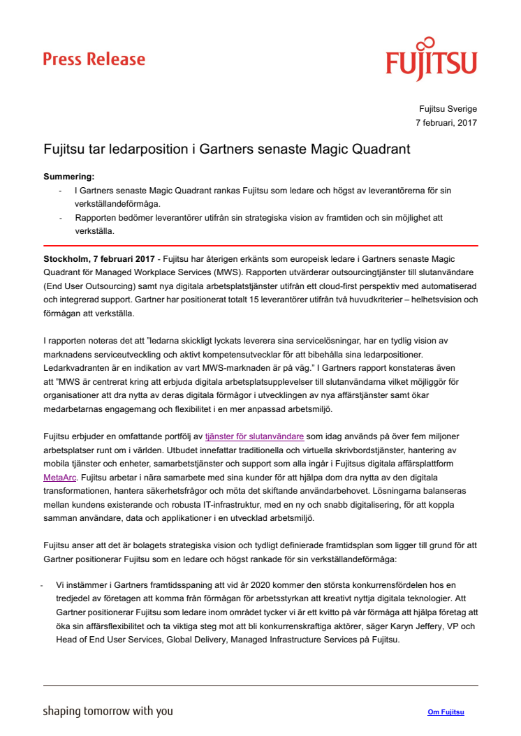 I Gartners senaste Magic Quadrant rankas Fujitsu som ledare och högst av leverantörerna för sin verkställandeförmåga.