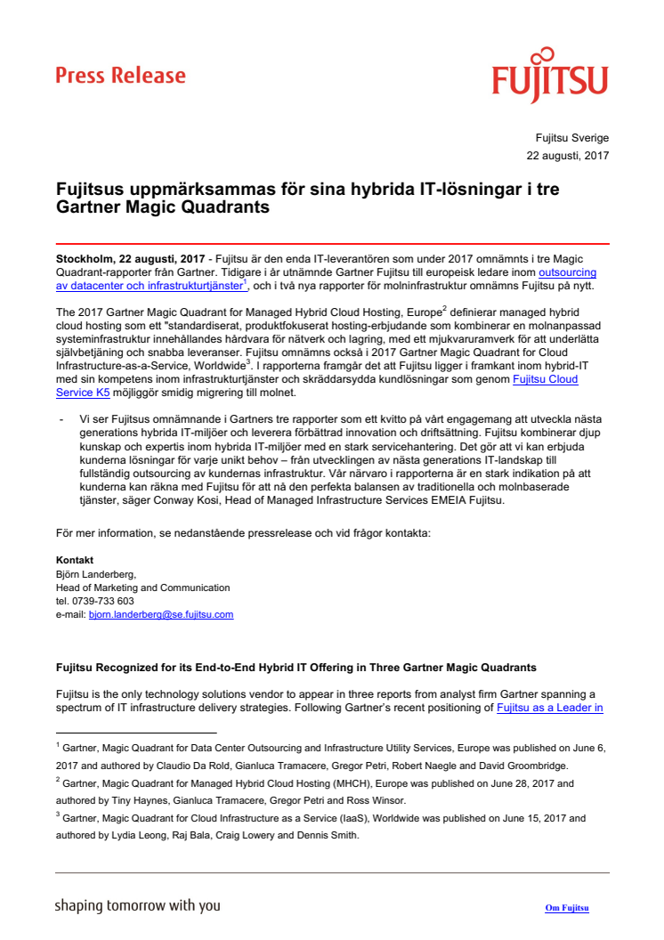 Fujitsu är den enda IT-leverantören som under 2017 omnämnts i tre Magic Quadrant-rapporter från Gartner. Tidigare i år utnämnde Gartner Fujitsu till europeisk ledare inom outsourcing av datacenter och infrastrukturtjänster, och i två nya rapporter för molninfrastruktur omnämns Fujitsu på nytt.