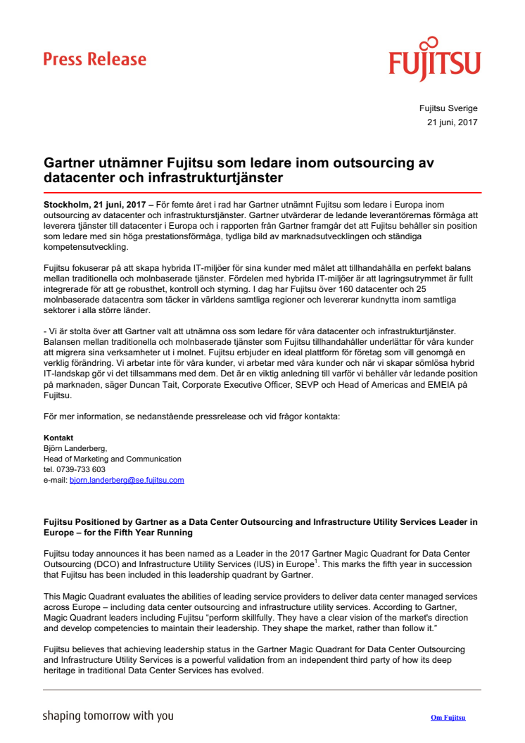För femte året i rad har Gartner utnämnt Fujitsu som ledare i Europa inom outsourcing av datacenter och infrastrukturstjänster. Gartner utvärderar de ledande leverantörernas förmåga att leverera tjänster till datacenter i Europa och Fujitsu behåller sin position som ledare med sin höga prestationsförmåga, tydliga bild av marknadens utveckling och ständiga kompetensutveckling.