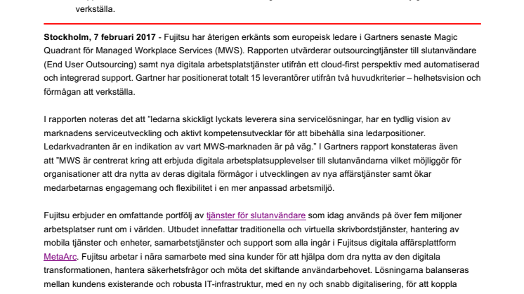 Stockholm, 7 februari 2017 - Fujitsu har återigen erkänts som europeisk ledare i Gartners senaste Magic Quadrant för Managed Workplace Services (MWS). Rapporten utvärderar outsourcingtjänster till slutanvändare (End User Outsourcing) samt nya digitala arbetsplatstjänster utifrån ett cloud-first perspektiv med automatiserad och integrerad support. Gartner har positionerat totalt 15 leverantörer utifrån två huvudkriterier – helhetsvision och förmågan att verkställa.