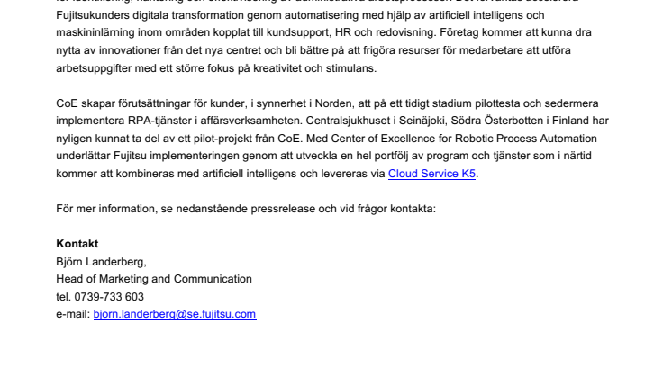 CoE skapar förutsättningar för kunder, i synnerhet i Norden, att på ett tidigt stadium pilottesta och sedermera implementera RPA-tjänster i affärsverksamheten. Centralsjukhuset i Seinäjoki, Södra Österbotten i Finland har nyligen kunnat ta del av ett pilot-projekt från CoE. Med Center of Excellence for Robotic Process Automation underlättar Fujitsu implementeringen genom att utveckla en hel portfölj av program och tjänster som i närtid kommer att kombineras med artificiell intelligens och levereras via Cloud Service K5.
