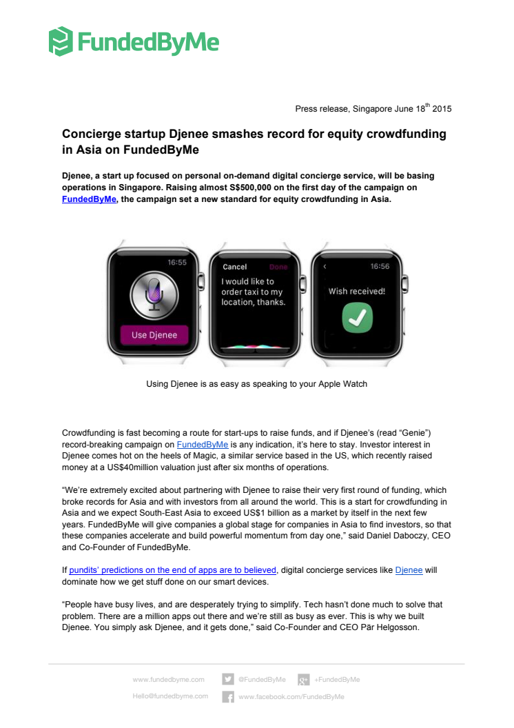 Djenee, a start up focused on personal on-demand digital concierge service, will be basing operations in Singapore. Raising almost S$500,000 on the first day of the campaign on FundedByMe, the campaign set a new standard for equity crowdfunding in Asia.
