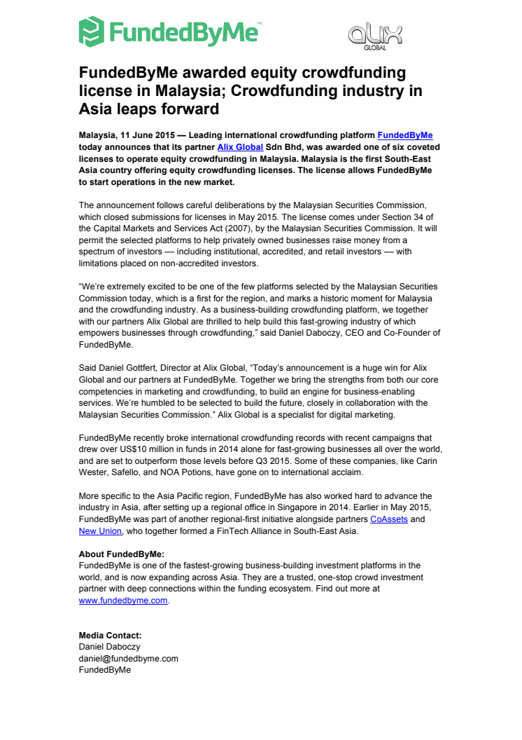 Leading international crowdfunding platform FundedByMe today announces that its partner Alix Global Sdn Bhd, was awarded one of six coveted licenses to operate equity crowdfunding in Malaysia. Malaysia is the first South-East Asia country offering equity crowdfunding licenses. The license allows FundedByMe to start operations in the new market.