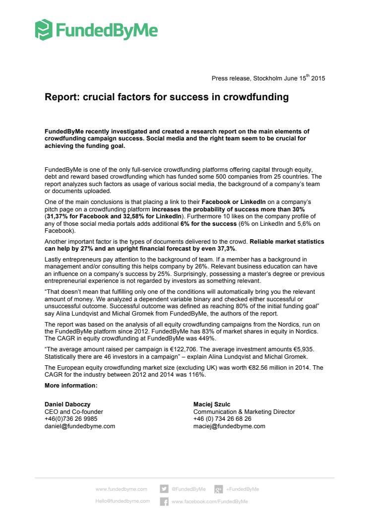 FundedByMe recently investigated and created a research report on the main elements of crowdfunding campaign success. Social media and the right team seem to be crucial for achieving the funding goal.
