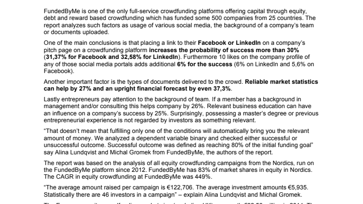 FundedByMe is one of the only full-service crowdfunding platforms offering capital through equity, debt and reward based crowdfunding which has funded some 500 companies from 25 countries. The report analyzes such factors as usage of various social media, the background of a company’s team or documents uploaded.