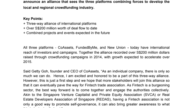 All three platforms - CoAssets, FundedByMe, and New Union - today have international reach of investors and campaigns. Together the alliance recorded over S$200 million dollars raised through crowdfunding campaigns in 2014, with growth expected to accelerate over 2015.
