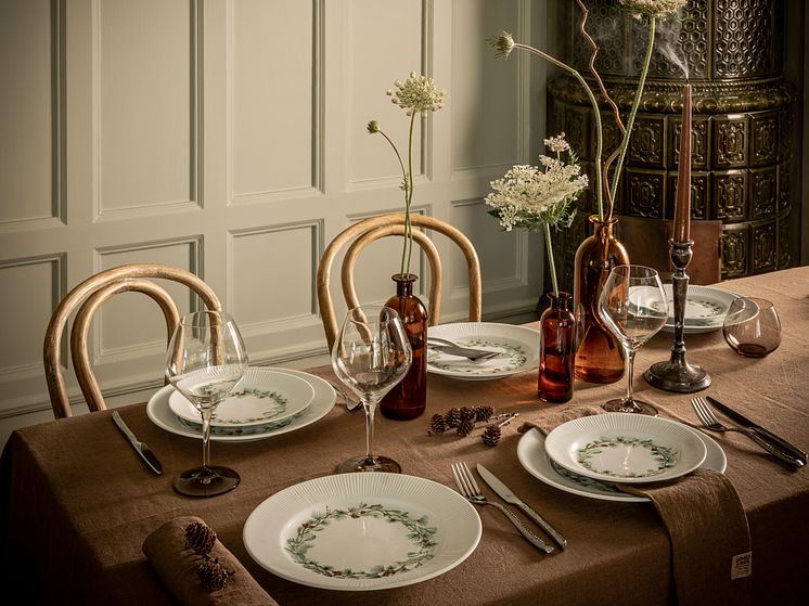 Fyrklövern Nordic Dawn Nature tallrik 27 cm och assiett 21 cm, Drop vinglas och Hammer bestick