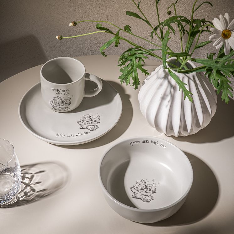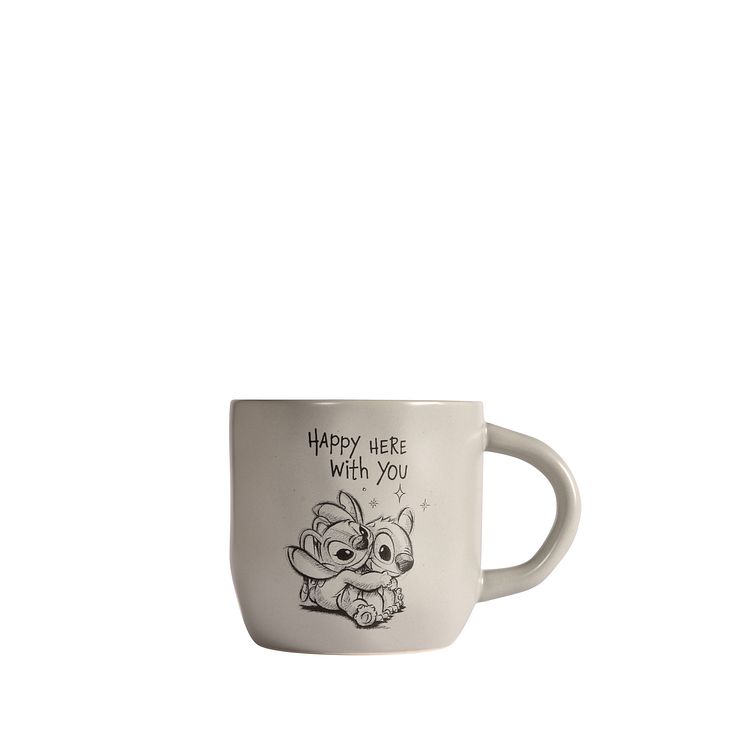 - Happy-setet i grått visar Stitch tillsammans med Angel och har citatet ”Happy here with you” – en varm påminnelse om att uppskatta nuet och varandra.