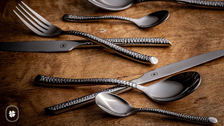 - Vi har lagt stor omsorg vid utformningen av bestickens handtag. Deras mjuka form och tyngd gör att de ligger bekvämt i handen, säger Catrin Sternsjö, designchef på Fyrklövern. Dessutom är de så snygga med sina hamrade detaljer och höjer upplevelsen vid varje måltid!