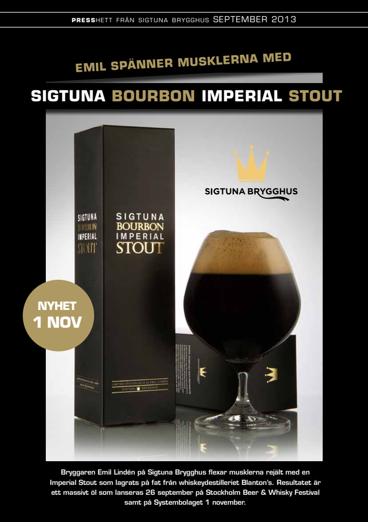 Bryggaren Emil Lindén på Sigtuna Brygghus flexar musklerna rejält med en Imperial Stout som lagrats på fat från whiskeydestilleriet Blanton’s. Resultatet är ett massivt öl som lanseras 26 september på Stockholm Beer & Whisky Festival samt på Systembolaget 1 november.