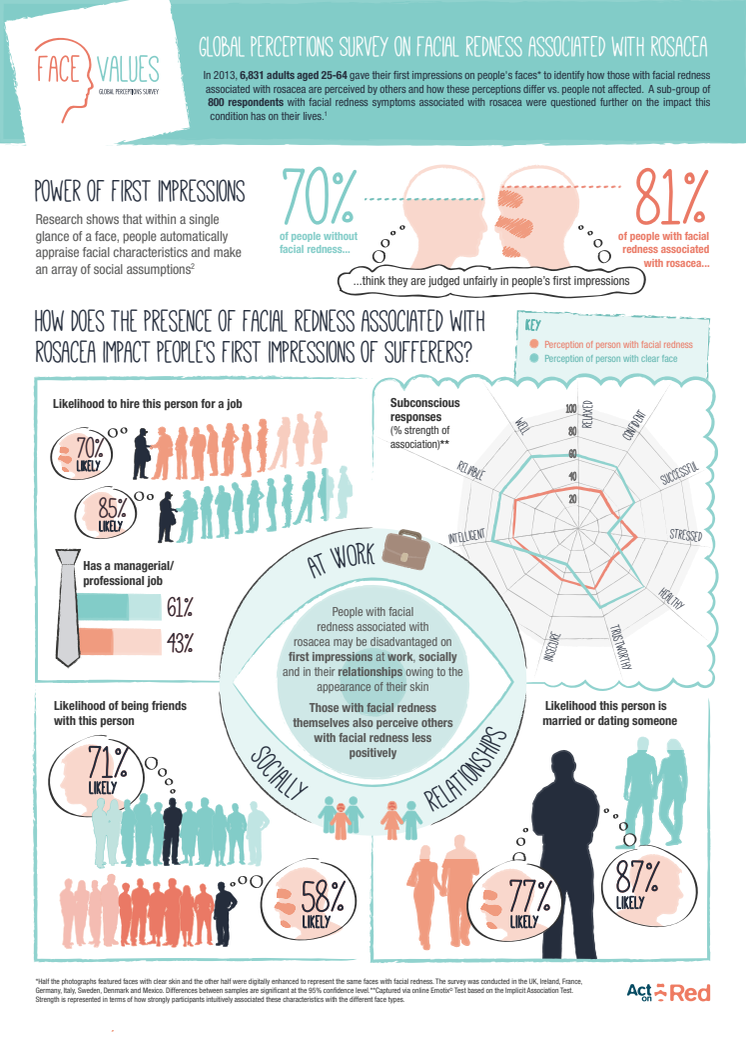Översiktsbild av de resultat som framkom i den globala studien; Face Value Perception Study. Personer som besväras av ihållande rodnad i ansiktet lider inte bara själva av sitt utseende. Studien visar också på hur omgivningen reagerar på röda ansikten och hur detta kan påverka livskvaliteten hos personer med rodnad i ansiktet.