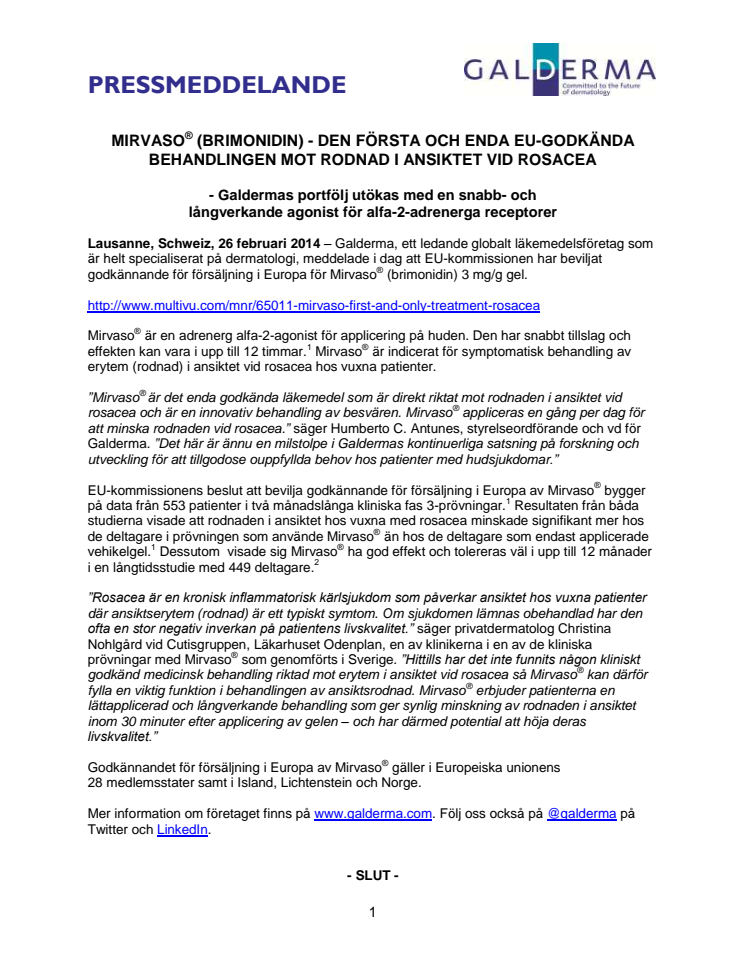 MIRVASO® (BRIMONIDIN) - DEN FÖRSTA OCH ENDA EU-GODKÄNDA BEHANDLINGEN MOT RODNAD I ANSIKTET VID ROSACEA