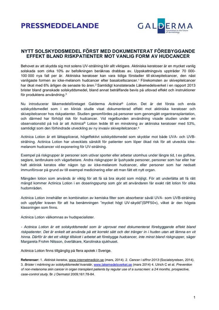Nu introducerar läkemedelsföretaget Galderma Actinica® Lotion. Det är det första och enda solskyddsmedlet som i en klinisk studie visat dokumenterad effekt mot aktiniska keratoser och skivepitelcancer hos riskpatienter.