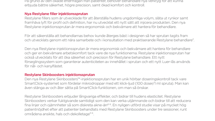 Den här lanseringen av helt nya injektionssprutor bygger vidare på det unika anseendet som varumärket Restylane har efter drygt 20 år inom den estetiska injektionsbehandlingsmarknaden. Restylane är ett högt respekterat varumärke bland både patienter och praktiserande läkare och sjuksköterskor och är uppbackat av omfattande, mångårig klinisk dokumentation (1).