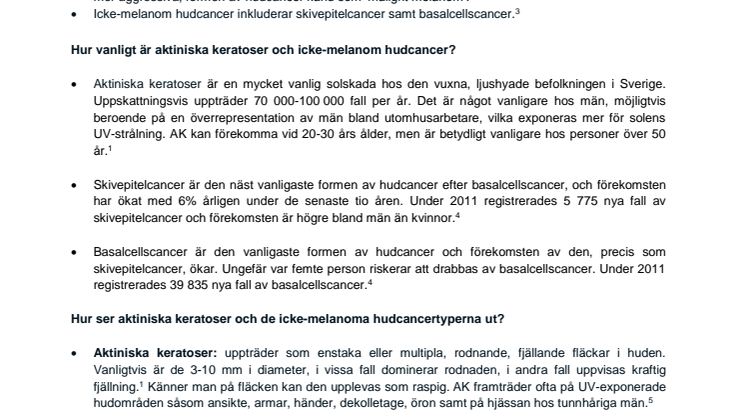Referenser: 1. Aktinisk keratos, www.internetmedicin.se (mars, 2014). 2. Cancer i siffror 2013 (Socialstyrelsen, 2014). 3. Brister i märkning av solskyddsmedel kvarstår, www.lakemedelsverket.se (mars 2014) 4. Ulrich C et al. Prevention of non-melanoma skin cancer in organ transplant patients by regular use of a sunscreen: a 24 months, prospective, case-control study. Br J Dermatol 2009;161:78-84.