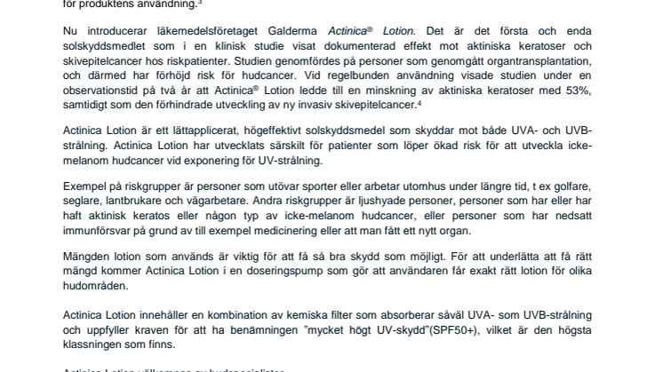 Nu introducerar läkemedelsföretaget Galderma Actinica® Lotion. Det är det första och enda solskyddsmedlet som i en klinisk studie visat dokumenterad effekt mot aktiniska keratoser och skivepitelcancer hos riskpatienter. Studien genomfördes på personer som genomgått organtransplantation, och därmed har förhöjd risk för hudcancer. Vid regelbunden användning visade studien under en observationstid på två år att Actinica® Lotion ledde till en minskning av aktiniska keratoser med 53%, samtidigt som den förhindrade utveckling av ny invasiv skivepitelcancer. (4)