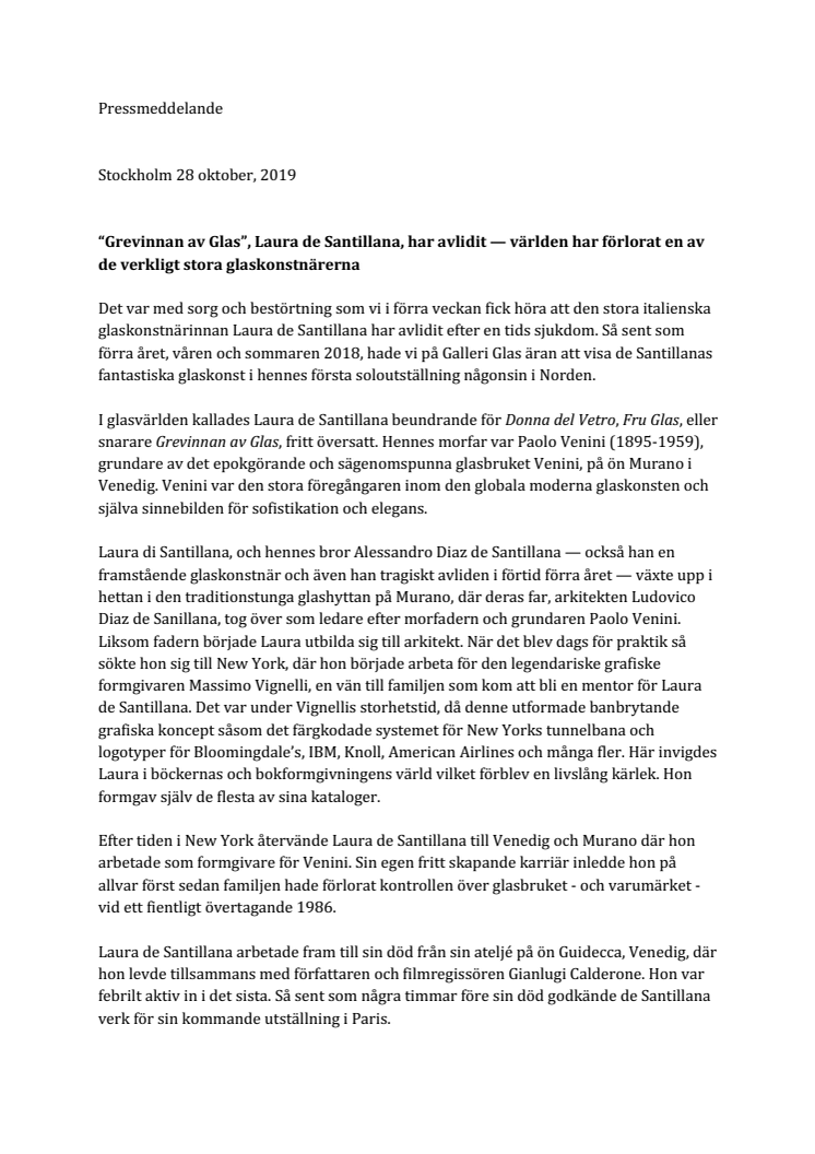 Det var med sorg och bestörtning som vi i förra veckan fick höra att den stora italienska glaskonstnärinnan Laura de Santillana har avlidit efter en tids sjukdom. Så sent som förra året, våren och sommaren 2018, hade vi på Galleri Glas äran att visa de Santillanas fantastiska glaskonst i hennes första soloutställning någonsin i Norden.