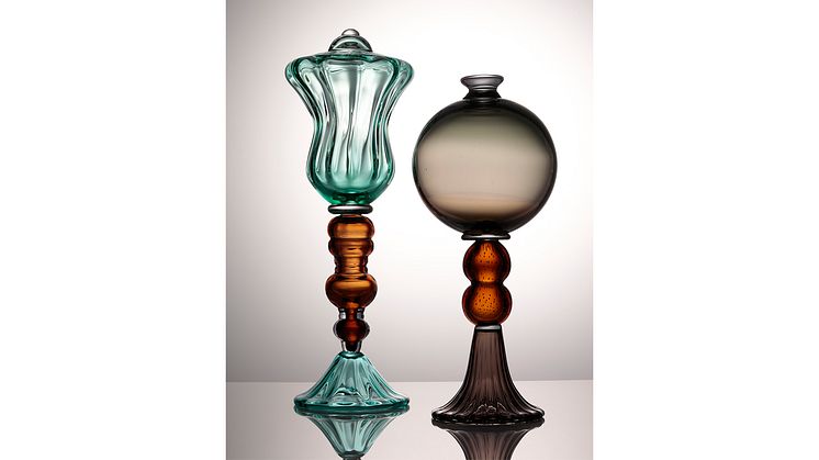 Båda de nya konstglasserier som visas i utställningen är skapade i samarbete med mästerblåsaren Micke Johansson.