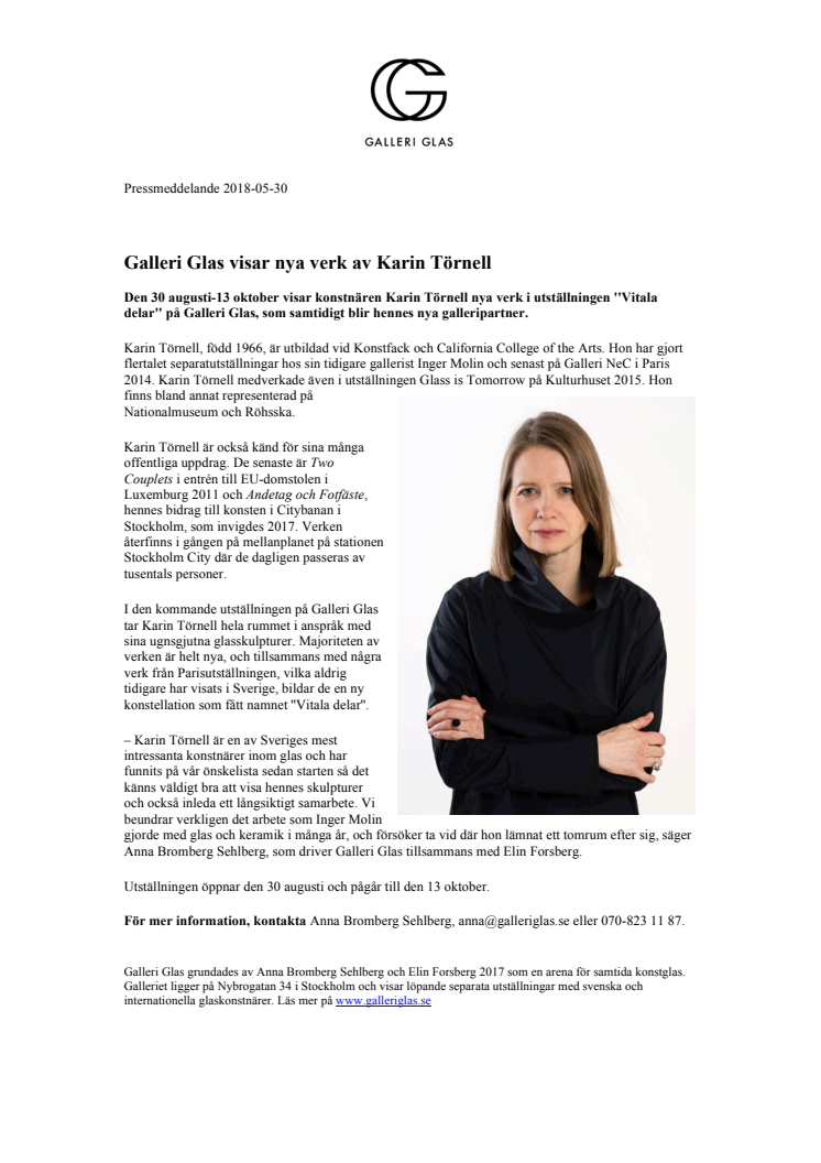 I den kommande utställningen på Galleri Glas tar Karin Törnell hela rummet i anspråk med sina ugnsgjutna glasskulpturer. Majoriteten av verken är helt nya, och tillsammans med några verk från Parisutställningen, vilka aldrig tidigare har visats i Sverige, bildar de en ny konstellation som fått namnet ''Vitala delar''.