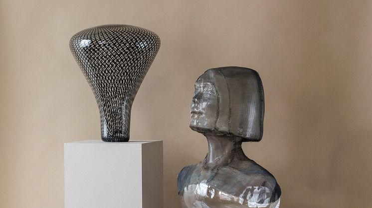 ”Jag blev fängslad av nätets förmåga att framhäva former med sin transparens och tygliknande egenskaper”, berättar Tone Linghult. ”Länge arbetade jag bara med nätet som jag ljussatte för att skapa skuggspel. Glaset upptäckte jag under en förberedande kurs och har sedan arbetat med under mina år på Konstfack. Jag skulpterar och syr ihop formerna för hand och blåser sedan glaset ned i formen”.