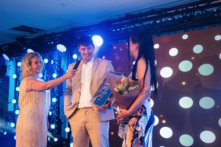Årets nyföretagare Jesper Johansson och Denice Johansson från GVE Padel håller tacktal.