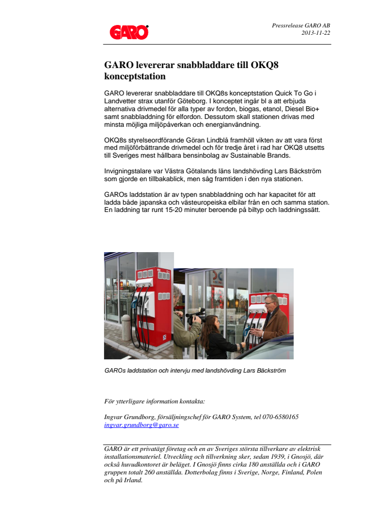 Det är en snabbladdare från GARO som kommer att ladda elbilarna på OKQ8 helt nya konceptstation Quick To Go. Drivmedel för alla typer av fordon, biogas, etanol, Diesel Bio+ samt snabbladdning av elfordon. Invigningen den 22 november inramades av bandklippning, tårta, bubbel och invigningstal av Västra Götalands läns landshövding Lars Bäckström.