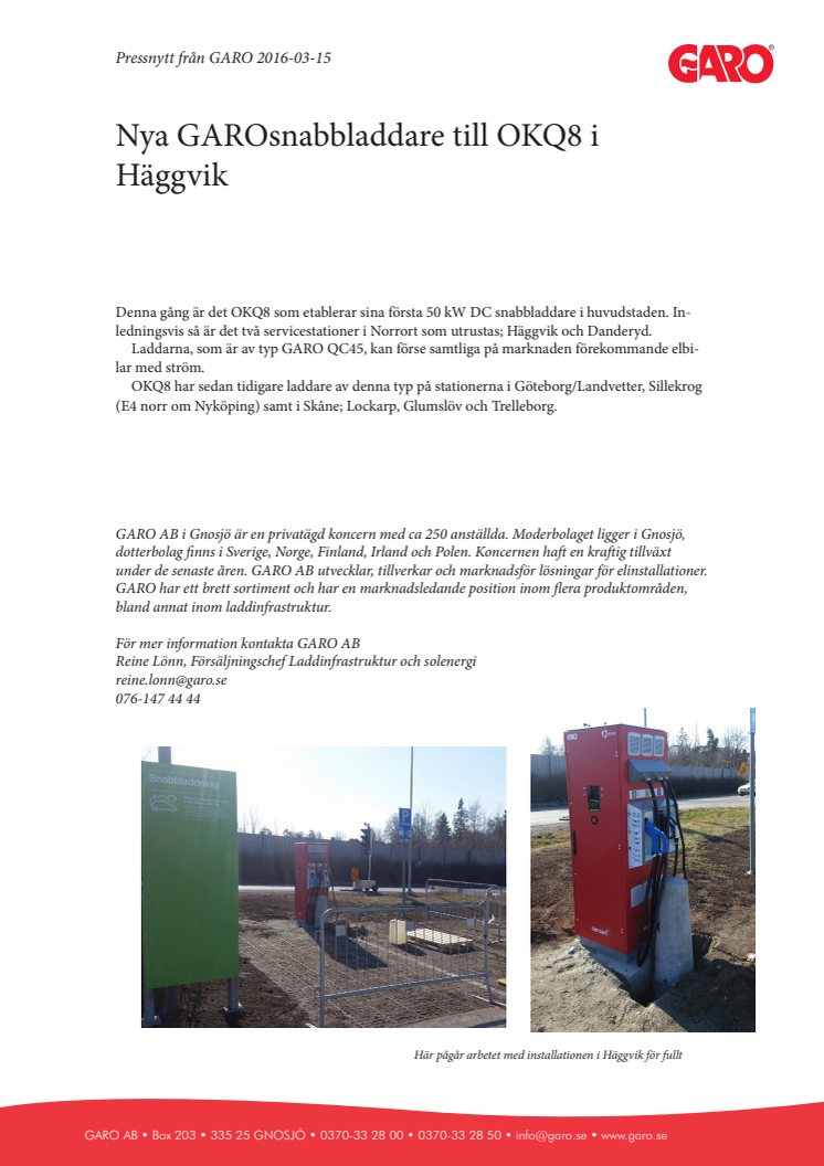 Snabbladdare från GARO installeras på OKQ8 i Häggvik