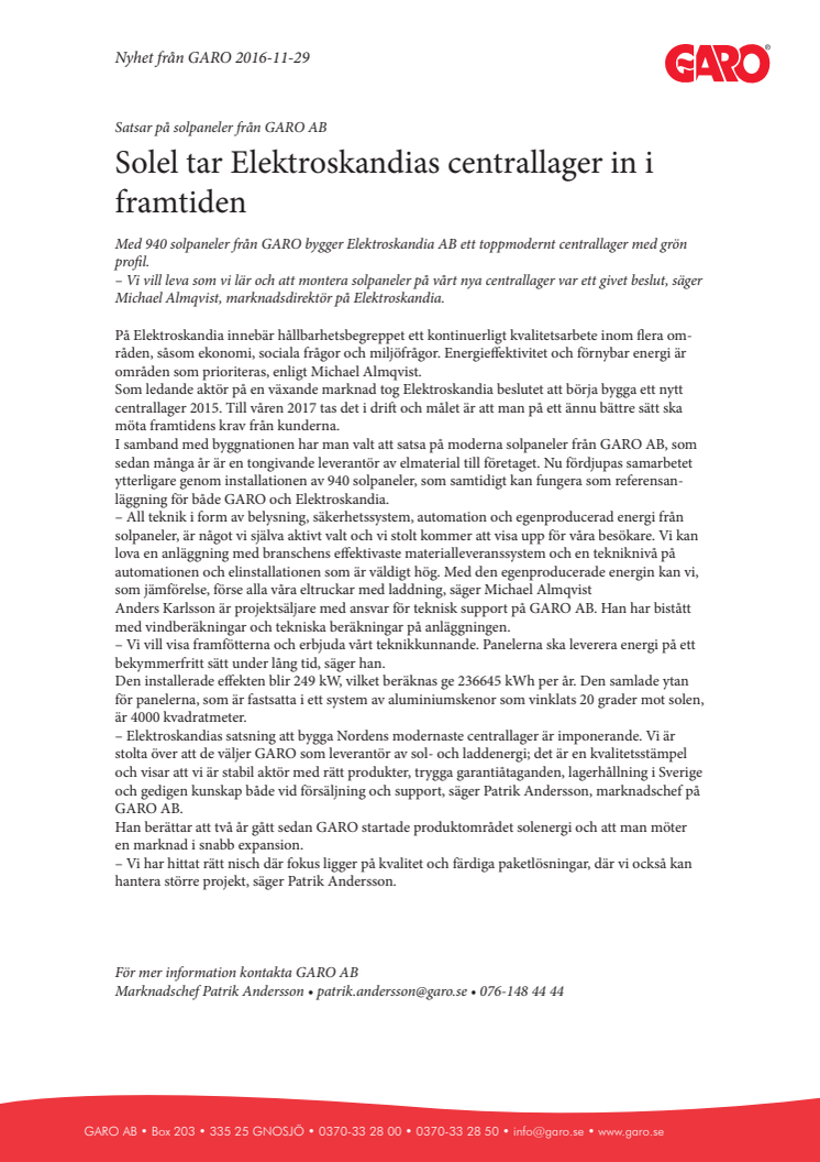 – Elektroskandias satsning att bygga Nordens modernaste centrallager är imponerande. Vi är stolta över att de väljer GARO som leverantör av sol- och laddenergi; det är en kvalitetsstämpel och visar att vi är stabil aktör med rätt produkter, trygga garantiåtaganden, lagerhållning i Sverige och gedigen kunskap både vid försäljning och support, säger Patrik Andersson, marknadschef på GARO AB.