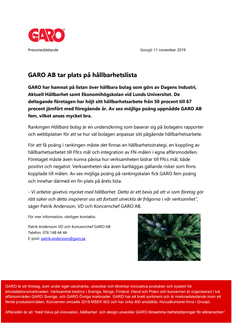 - Vi arbetar givetvis mycket med hållbarhet. Detta är ett bevis på att vi som företag gör rätt saker och detta inspirerar oss att fortsatt utveckla de frågorna i vår verksamhet”, säger Patrik Andersson, VD och Koncernchef GARO AB.