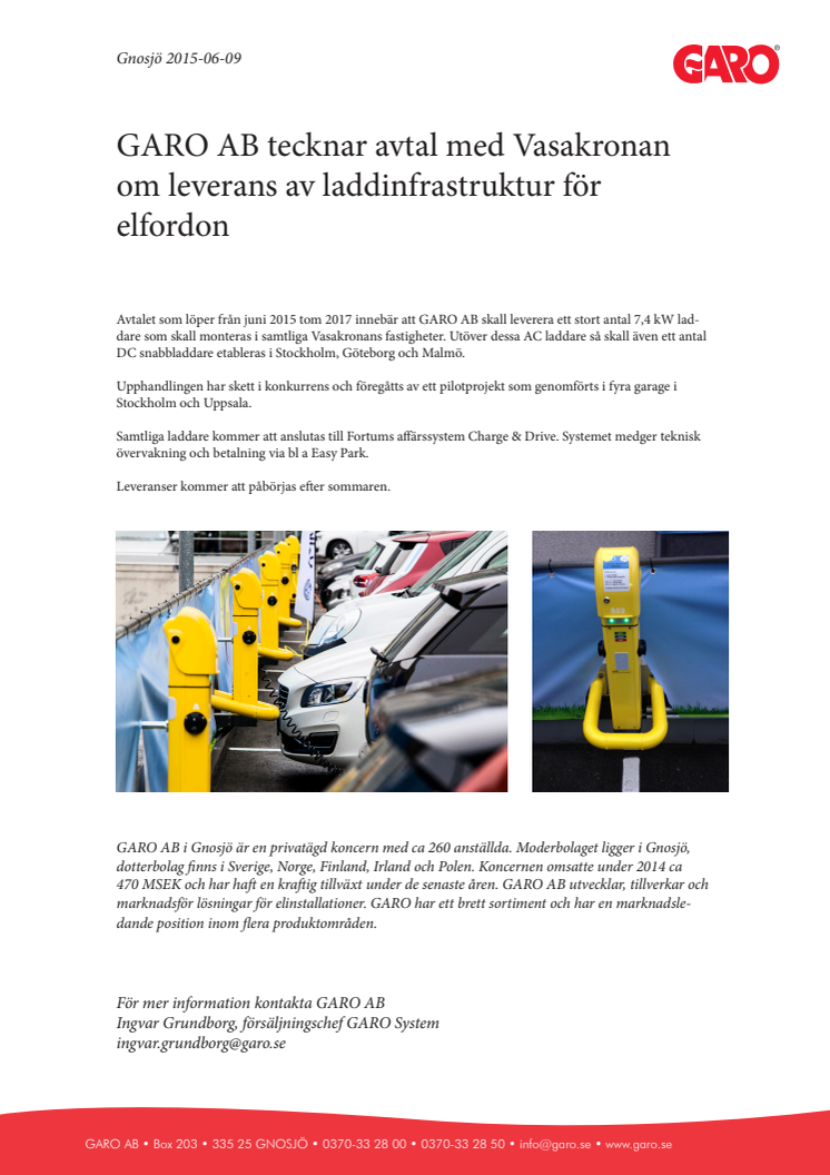 Avtalet som löper från juni 2015 tom 2017 innebär att GARO AB skall leverera ett stort antal 7,4 kW laddare som skall monteras i samtliga Vasakronans fastigheter. Utöver dessa AC laddare så skall även ett antal DC snabbladdare etableras i Stockholm, Göteborg och Malmö.