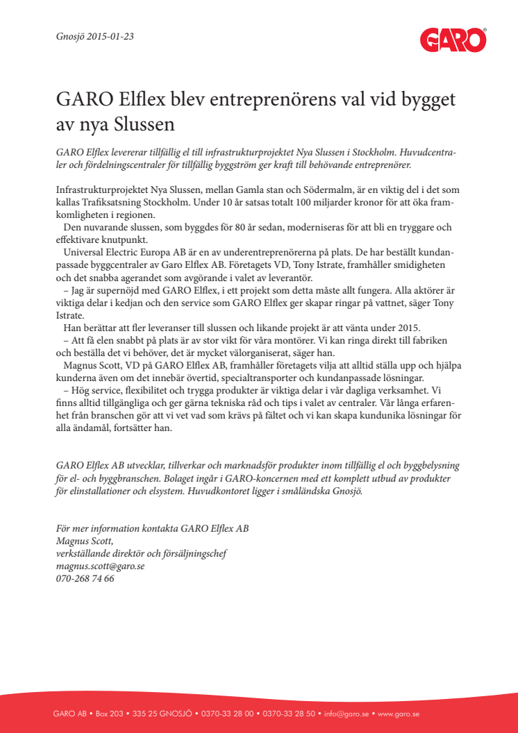 – Jag är supernöjd med GARO Elflex, i ett projekt som detta måste allt fungera. Alla aktörer är viktiga delar i kedjan och den service som GARO Elflex ger skapar ringar på vattnet, säger Tony Istrate.