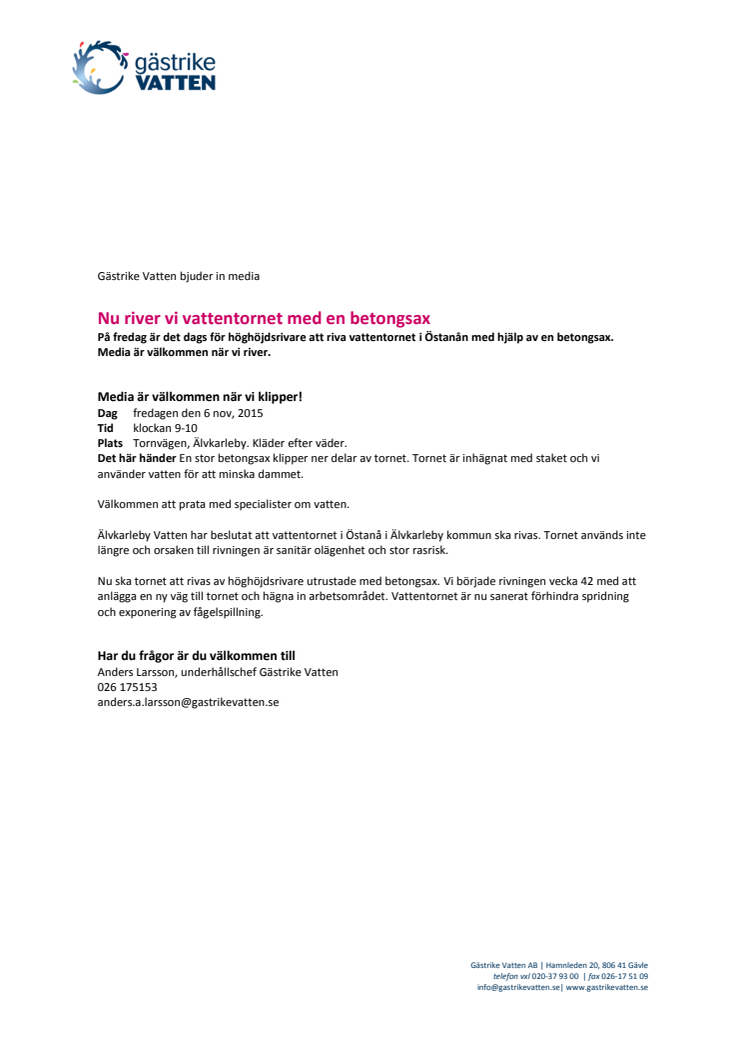 På fredag är det dags för höghöjdsrivare att riva vattentornet i Östanån med hjälp av en betongsax. Media är välkommen när vi river.
