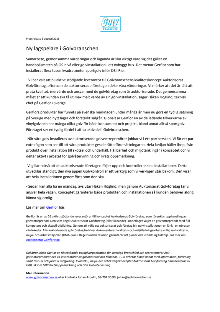 Samarbete, gemensamma värderingar och laganda är lika viktigt vare sig det gäller en handbollsmatch på OS-nivå eller golvinstallationen i ett nybyggt hus. Det menar Gerflor, aktivt stödjande leverantör till kvalitetskonceptet Auktoriserat Golvföretag, som inför OS i Rio installerat flera tusen kvadratmeter sportgolv.