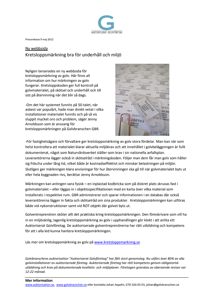 Nu lanseras en ny webbsida för kretsloppsmärkning av golv. Här finns all information om hur märkningen fungerar. Kretsloppskoden ger full kontroll på golvmaterialet, skötsel/underhåll samt till sist på återvinningen.