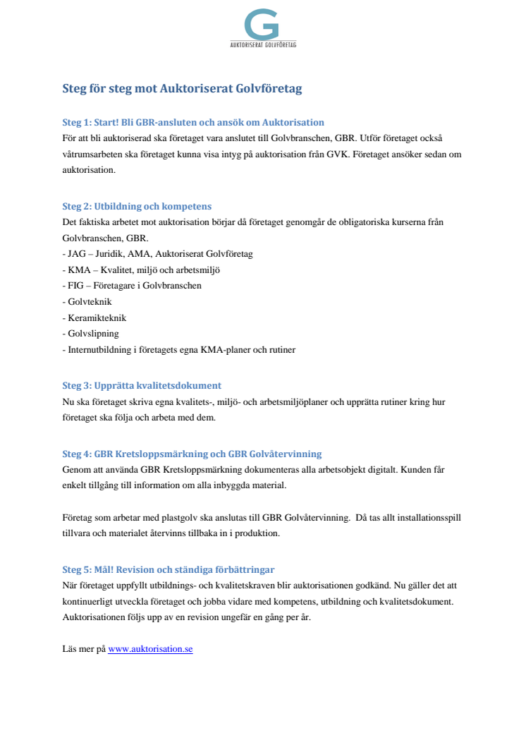 Här finns en praktisk handledning för att bli Auktoriserat Golvföretag, Golvbranschen GBRs auktorisation som är ett kvalitetskvitto på golvföretagets kompetens.