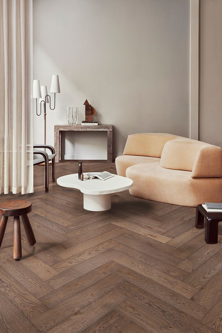 Segno Ek Old Brown är ett fiskbensparkettgolv, laserat i en varm mörkbrun ton som anknyter till den moderna retrotrenden där mörka golv tar plats och ger ett sobert, tryggt och lugnt intryck.