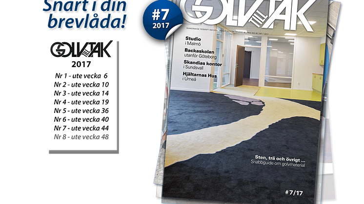 Senaste numret av branschtidningen Golv till Tak är fylld av inspiration och intressanta projekt. Rätt golv på rätt plats är mottot. Den 14 våningar höga mötesplatsen Studion i Malmö, Backaskolan i Göteborg, Skandias Sundsvallskontor och anhörighuset Hjältarnas Hus vid Norrlands Universitetssjukhus i Umeå är några golvintensiva platser i Sverige just nu. Och vad betyder Sveriges renaste bygge i praktiken? Du hittar dessutom en snabbguide i golvmaterial samt bransch- och produktnytt i Golv till Tak nr 7.