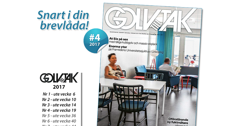 Hotell och sjukhus har minst en gemensam nämnare, nämligen behovet av hållbara, slitstarka och lättskötta golv. I vårens sista nummer av Golv till Tak får vi en rundtur i nya prestigehotellet At Six i Stockholm och på Universitetssjukhuset i Linköping som just nu moderniserar sina enorma ytor. Redaktionen undrar också vart dra-bort-limmet tog vägen samt berättar om två smarta produkter för fuktmätning – varav en vann guld på Nordbygg. Golv till Tak nr 4, snart i en brevlåda nära dig!