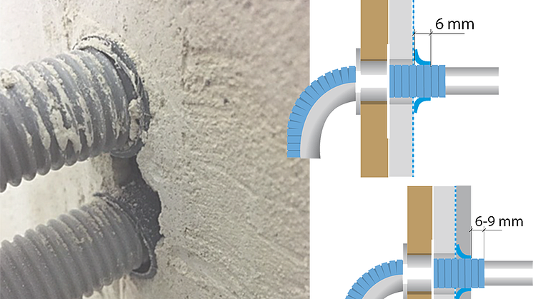 - Skyddsrör, genomföringsdetalj eller plasthölje på rör kapas 6 till 9 mm utanför färdigt ytskikt. Vid kapningen får ingen åverkan göras på tätningen.