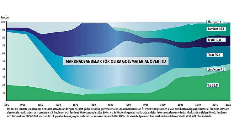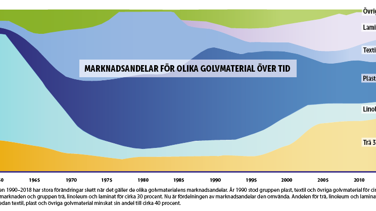 Fördelningen mellan de olika golvmaterialen har i stort sett varit konstant de senaste åren. Gruppen trägolv behåller förstaplatsen och ökar något, främst inom massiva trägolv men även fanér. Plastgolv är fortsatt den näst största materialgruppen men backade under året med drygt 4 procent. Även segmentet textilgolv minskade markant liksom linoleumgolv som föll med hela 11 procent efter att i flera år ha legat på en stabil nivå.