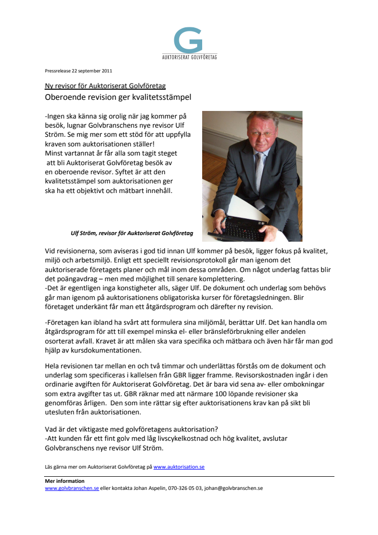 -Ingen ska känna sig orolig när jag kommer på besök, lugnar Golvbranschens nye revisor Ulf Ström. Se mig mer som ett stöd för att uppfylla kraven som auktorisationen ställer! Minst vartannat år får alla som tagit steget att bli Auktoriserat Golvföretag besök av en oberoende revisor. Syftet är att den kvalitetsstämpel som auktorisationen ger ska ha ett objektivt och mätbart innehåll.
