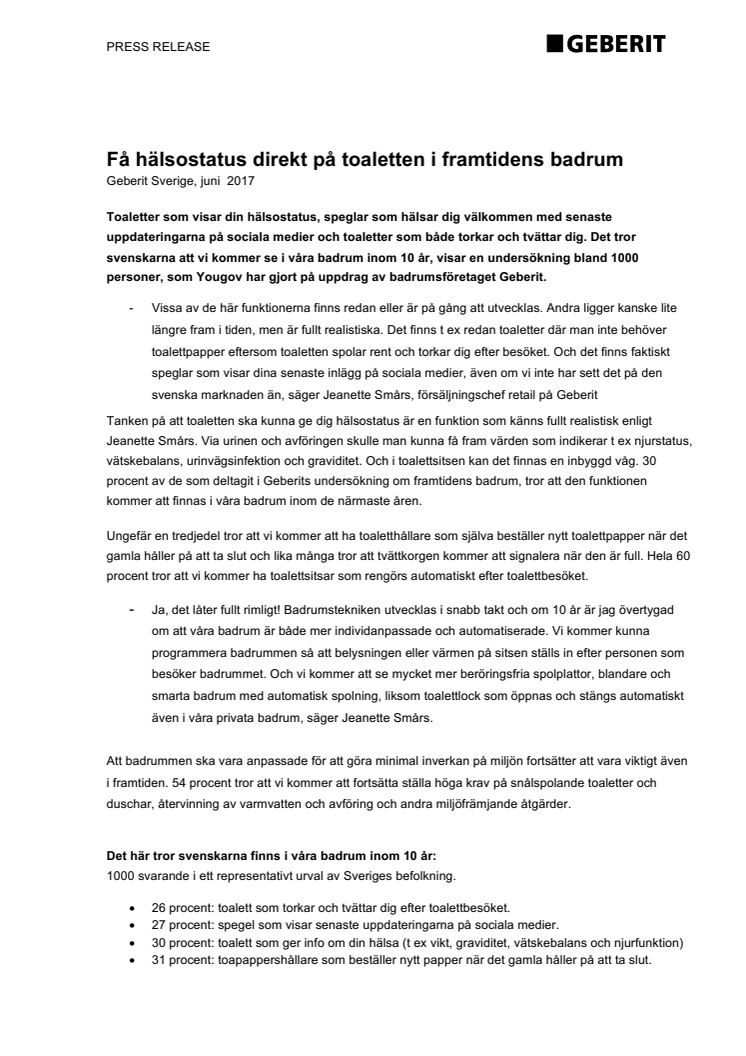 Snart har vi toaletter som visar hur vi mår, speglar som hälsar oss välkomna med senaste uppdateringarna på sociala medier och toaletter som både torkar och tvättar oss. Det tror i alla fall 1000 svenskar som har fått frågan hur våra badrum ser ut om 10 år. Och enligt badrumsföretaget Geberit är det inte bara rimligt utan högst troligt att de får rätt.