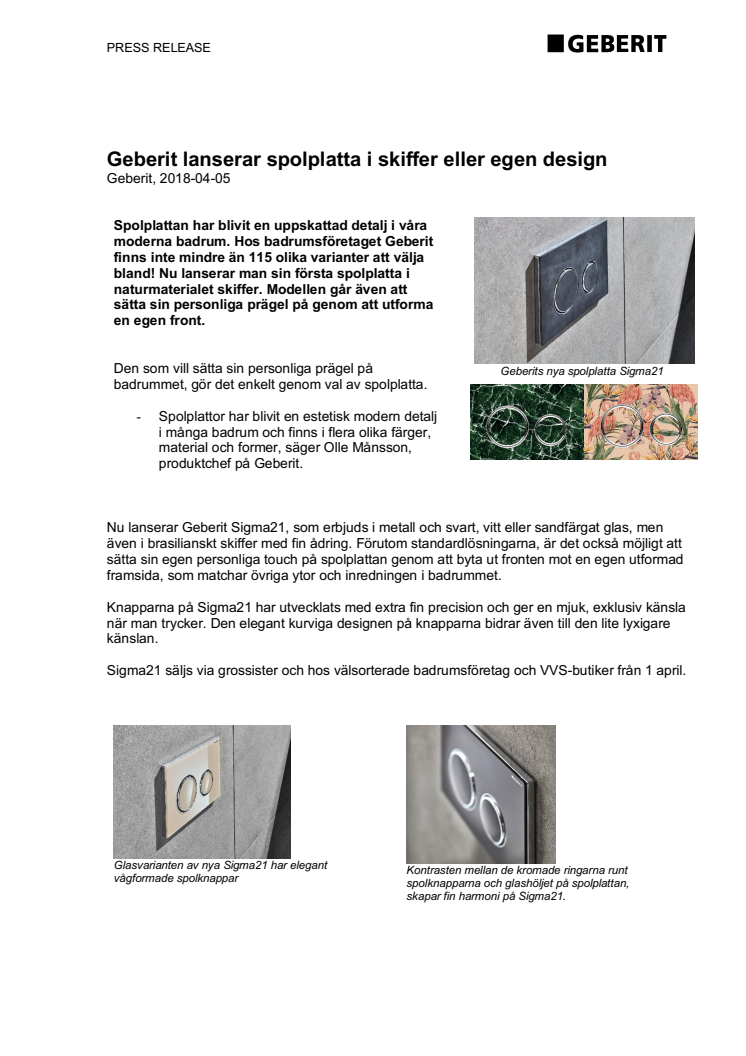 Spolplattan har blivit en uppskattad detalj i våra moderna badrum. Hos badrumsföretaget Geberit finns inte mindre än 115 olika varianter att välja bland! Nu lanserar man Sigma21 - Geberits första spolplatta i naturmaterialet skiffer. Modellen går även att sätta sin personliga prägel på genom att utforma en egen front.